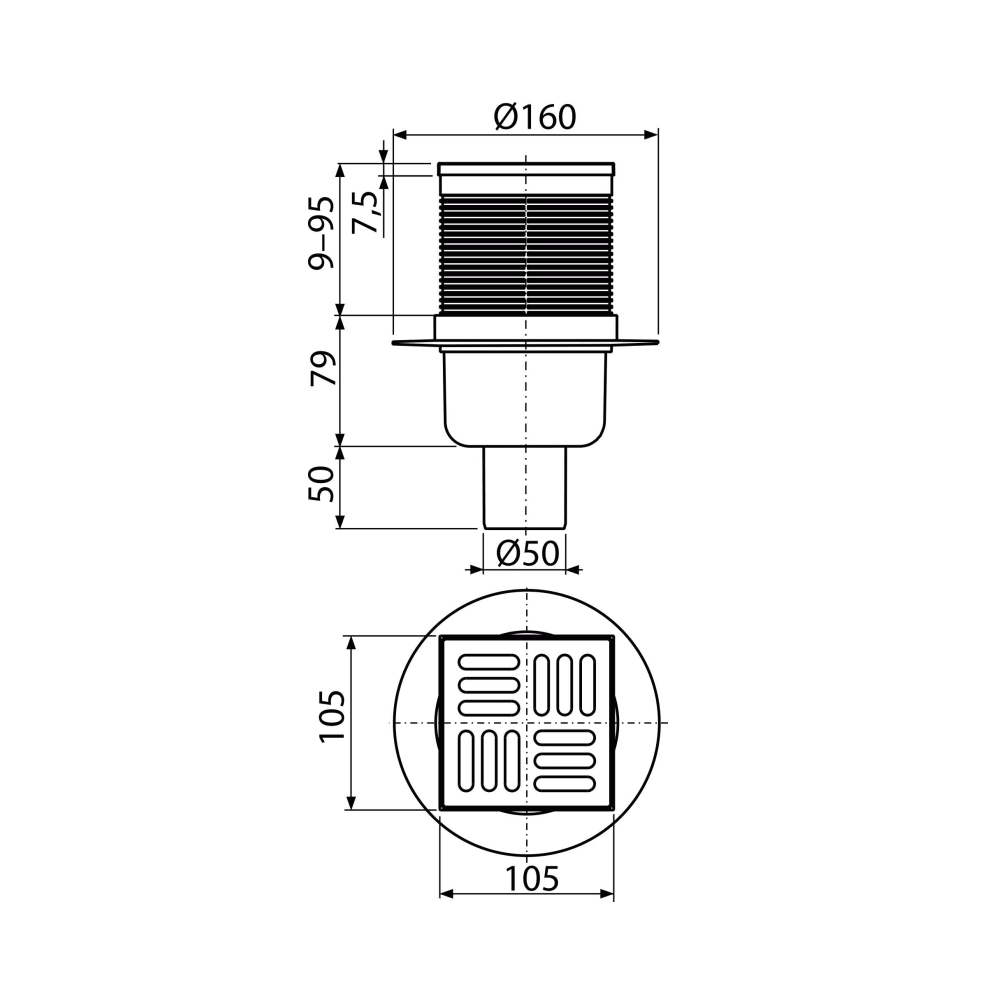 Alca Drain APV2 105x105 Chrome podni slivnik sa visinom ugradnje 138-224mm, mokrim sifonom, pokrivnom perforiranom rešetkom od nerđajućeg čelika debljine 5mm i vertikalnim odvodom Ø50mm