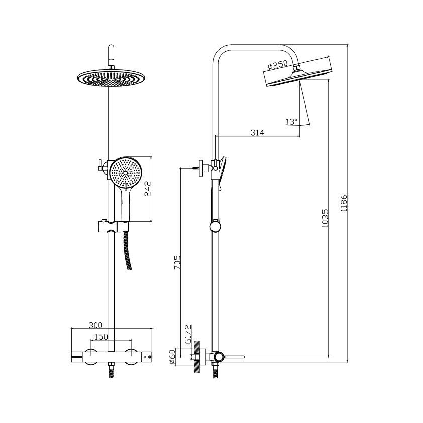Usponski tuš Ultima od brenda Giusta je predzidni tuš set izrađen je u standardnoj Chrome završnoj obradi. Glavni deo ovog seta je baterija (slavina) na kojoj se nalazi mešač i prebacivač. Sa desne strane baterije nalazi se mešač za toplu i hladnu vodu, dok je sa leve strane kružni prebacivač za usmeravanje mešane vode sa ručnog na nadglavni tuš i obrnuto. Ručni tuš set pozicioniran je na kliznom držaču na usponskoj šipki na čijem kraju se nalazi okrugli nadglavni tuš prečnika 250mm.
